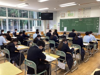 11月4日(火)に3年生とその保護者を対象に親子進路説明会を実施しました。参加していただいた保護者の皆様、ご多忙の中、参加いただきありがとうございました。今回は、今後の進路選択の流れやWEBシステムを用いた出願手続きなど、より細かい内容について説明しました。生徒はクロムブックに配信された資料を参考にしながら、今後の流れの詳細を確認しました。これから、生徒は学級担任と個人面談等を行いながら進路選択について話し合い、11月末から始まる三者面談において私立高校の出願校や公立高校の特色化選抜・公立推薦を希望するかどうかなど、詳細を決定していきます。つきましては、ご家庭でも機会があるたびにお子さまの進路について、話し合う時間を設けていただきたいと思います。また、今週は進路選択において大変重要となる後期中間考査も始まります。生徒の皆さんには、これまで授業や家庭学習を頑張ってきた成果を発揮してほしいと思います。
