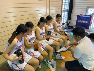 1試合目の那珂川南中戦では、序盤お互いに緊張してシュートが入らず、なかなか試合が動きませんでした。しかし、徐々に相手の速攻やゴール下のシュートが入り始め、1Q7-20で終了しました。そこから2Q10-12、3Q12-11と互角の攻防を繰り返しましたが、人数の差から少しずつ体力の差が見られるようになり、4Qは4-14、最終スコアは33-57と惜しくも負けてしまいました。