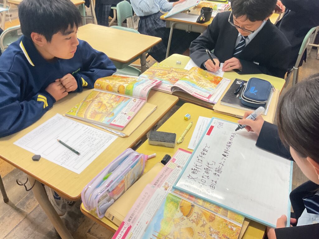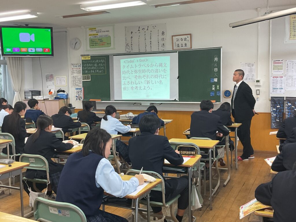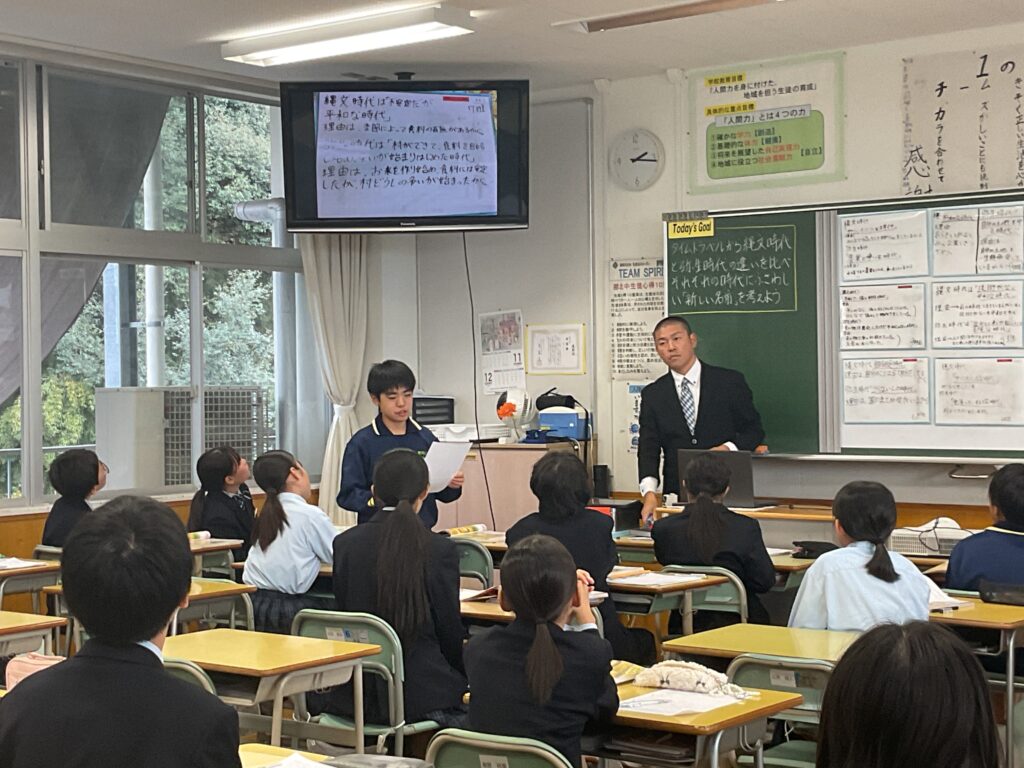 1年1組において、石丸先生の研究授業を行いました。本時の学習では、縄文時代と弥生時代の人々の暮らしを描いた資料の絵をもとに、二つの時代の違いについて考えました。生徒たちは、住居のつくりや生活の様子、道具の使われ方などに着目しながら、気付いた点を積極的に発表していました。 次に、見つけた違いをもとに、「それぞれの時代に名前を付けるとしたらどうなるか」という課題に取り組みました。生徒たちは、話合いを通して意見を出し合い、「どのような暮らしをしていた時代なのか」を意識しながら、時代の特徴を言葉で表そうとしていました。 授業を通して、生徒は縄文時代と弥生時代を個別の知識として捉えるだけでなく、暮らしや住居といった視点から時代全体を大きく捉えることができました。主体的に考え、仲間の意見を聞きながら学びを深める姿が多く見られた研究授業となりました。