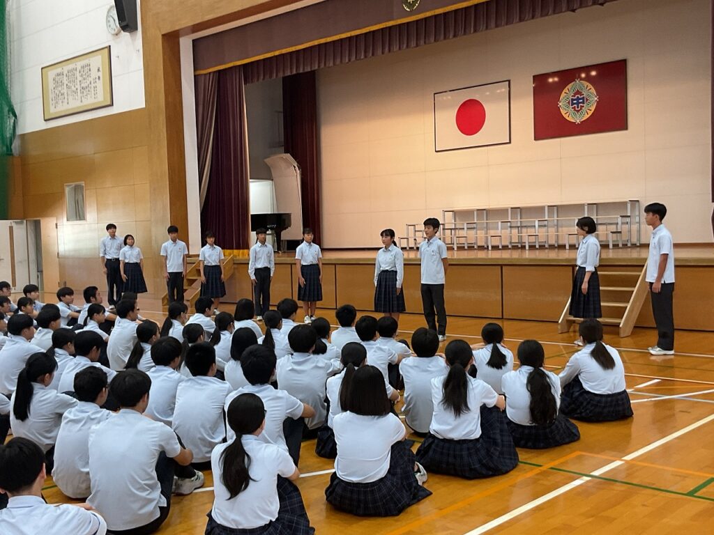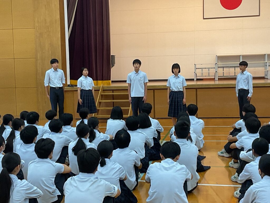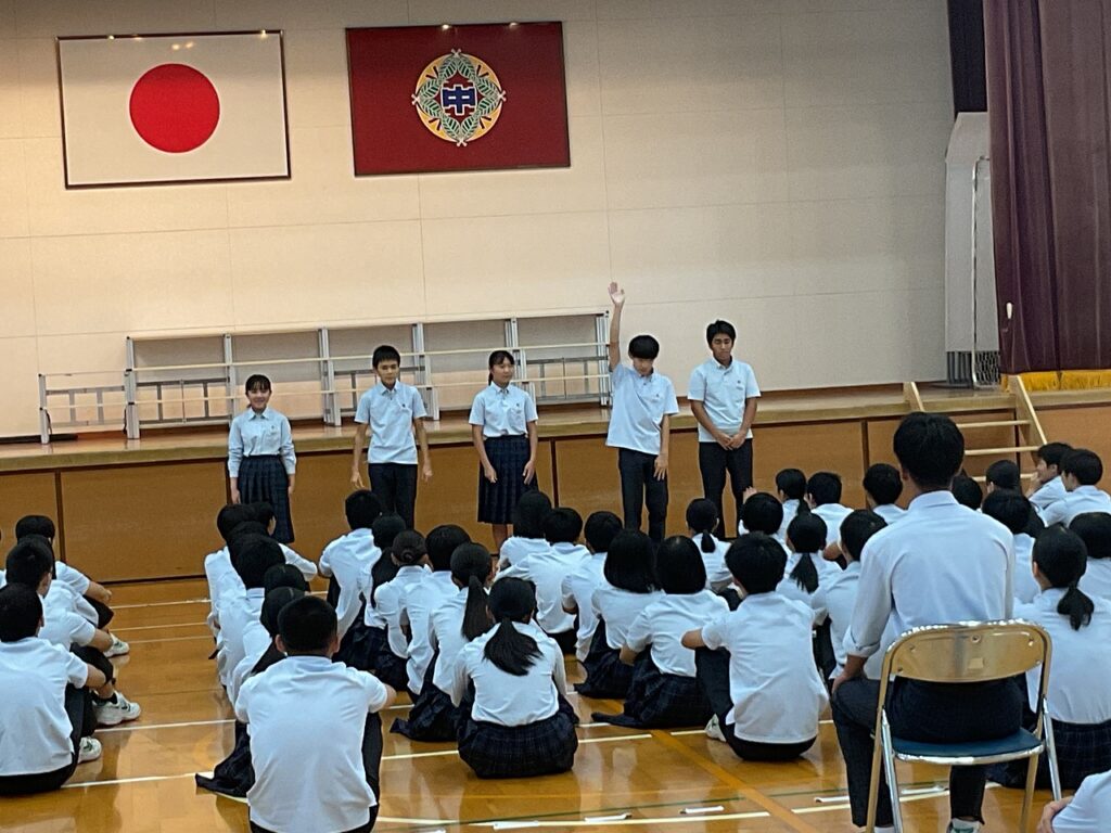 はじめに、学級委員が各クラスを代表して、これまでの生活や活動を振り返りました。良かった点については、仲間を思いやる姿勢や協力して行事に取り組んだことなどが挙げられ、互いの成長を確かめ合う機会となりました。一方で、時間の使い方や課題への取り組み方に関して改善すべき点も率直に発表され、後期に向けて意識を高める姿が見られました。