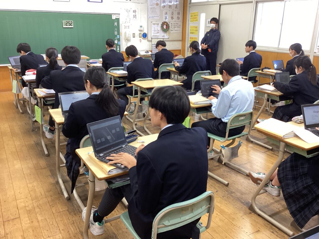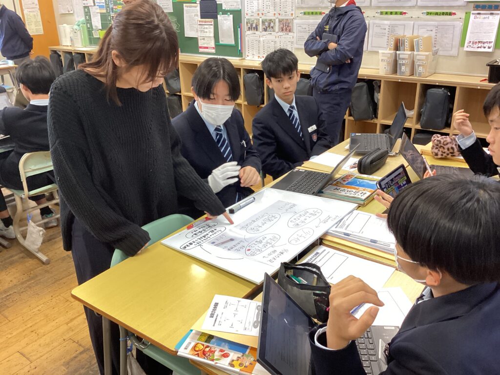 授業では、思考ツールとして「ループ図」を活用しました。少子化は、出生数の減少だけでなく、雇用、経済、子育て環境、社会保障など、複数の要因が相互に関係し合って進行しています。生徒たちは、ループ図を用いて要因同士のつながりを可視化し、「なぜ少子化が進むのか」「政策がどこに影響を与えるのか」を整理しながら考えを深めていきました。