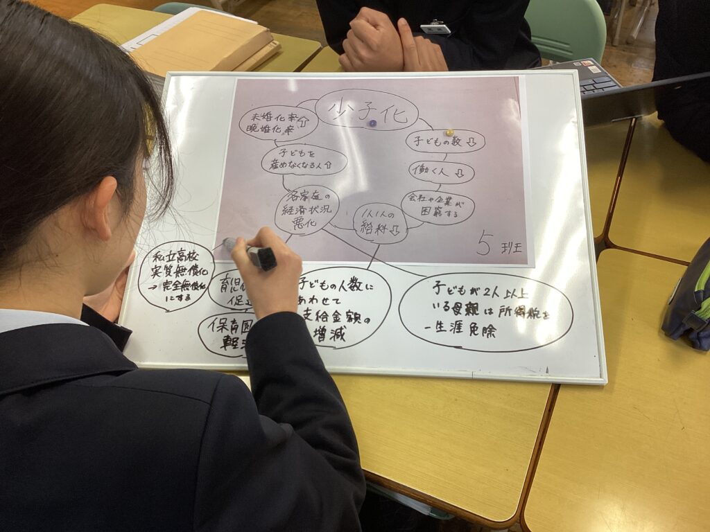 授業を通して、生徒たちは一つの政策だけで問題が解決するわけではなく、複数の要素が循環的に関わっていることに気付きました。また、自分の考えを図や言葉で説明することで、少子化問題を自分事として捉える姿が見られました。