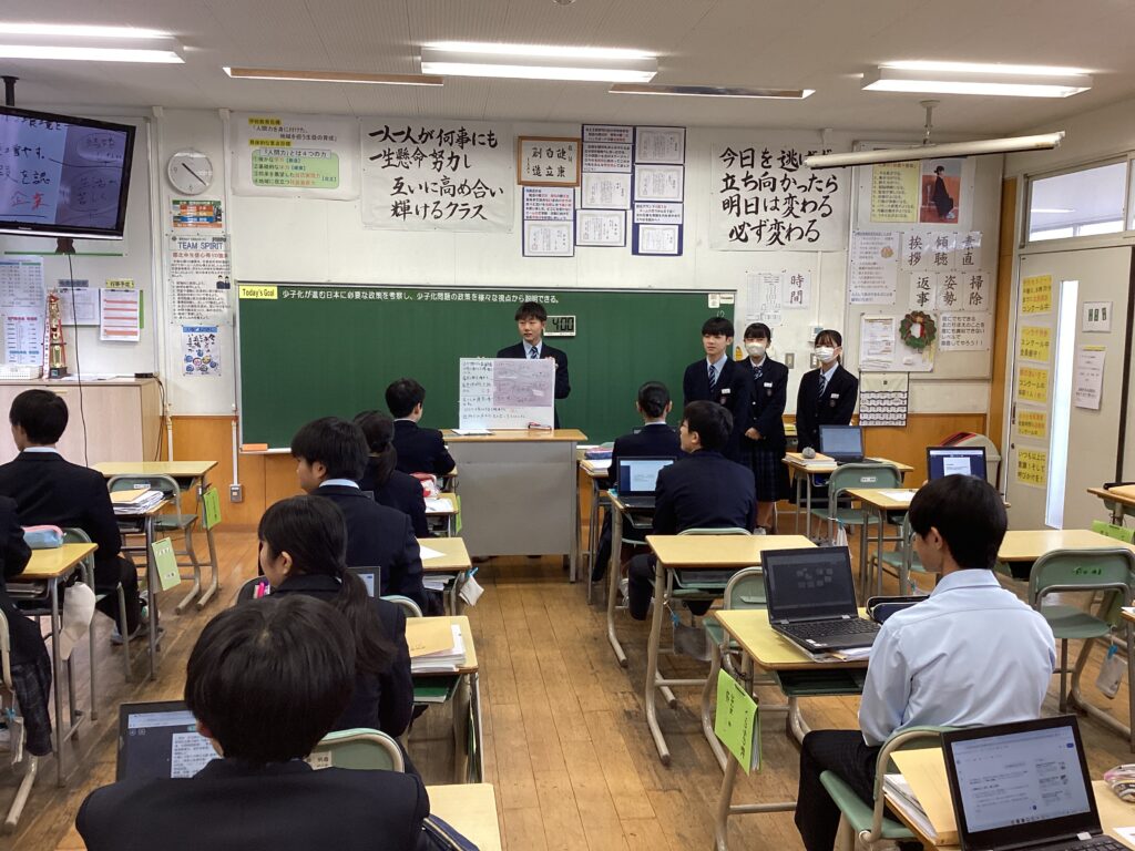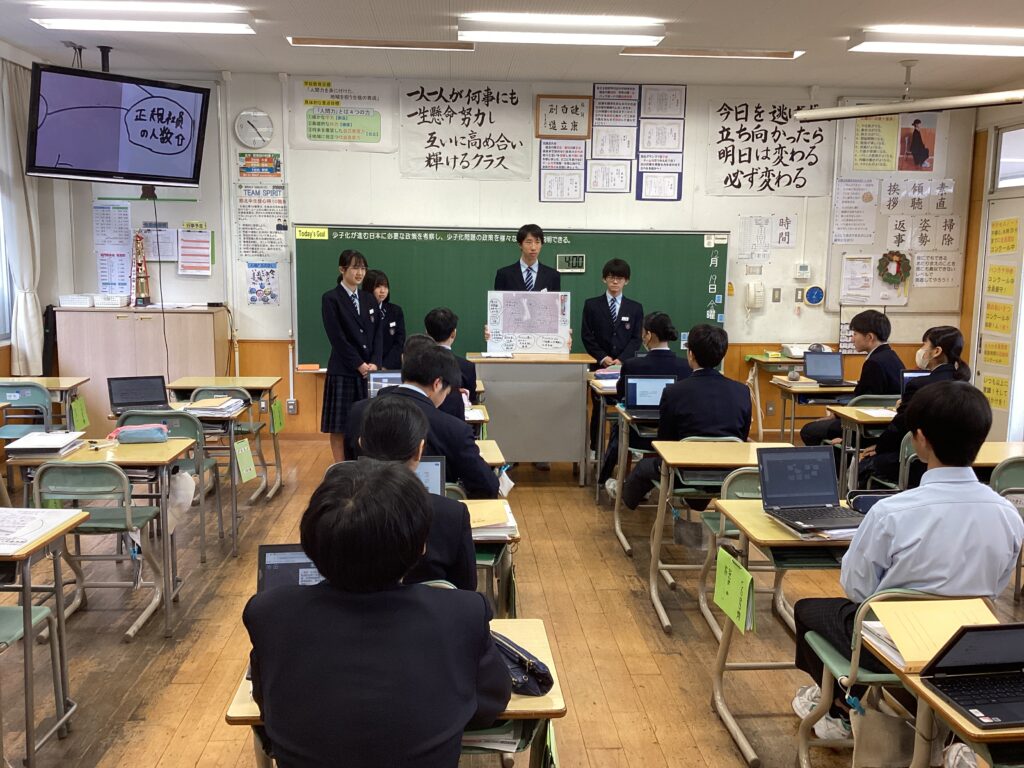 学習活動では、国が行っている子育て支援策や補助金制度を資料から読み取り、その効果と課題を検討しました。その上で、「経済的支援だけで十分なのか」「働き方や地域の役割はどうあるべきか」など、立場や視点の違いを意識しながら意見交換を行いました。生徒からは、保育環境の充実、若者の雇用安定、男性の育児参加促進など、具体的で現実的な提案が多く出されました。