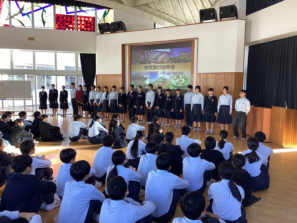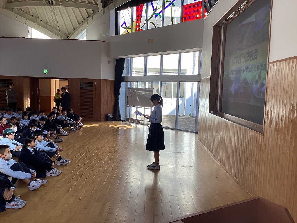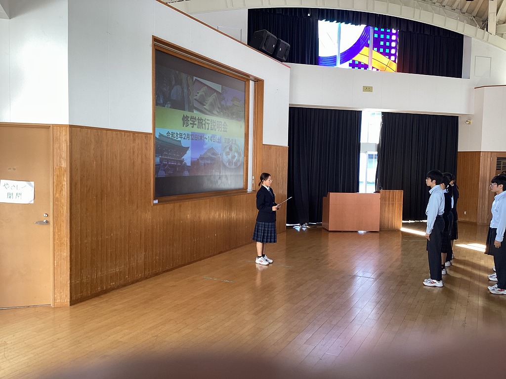 本日、2学年では修学旅行についての日程等の説明会を行いました。 新しく決まった実行委員たちがプレゼンテーションを使って、スローガンを発表し、 日程説明をしました。また、係ごとの仕事内容を話しました。 来週は、内容を見直し、保護者に向けて説明会が行われます。 2学年保護者の皆さんどうぞよろしくお願いします。