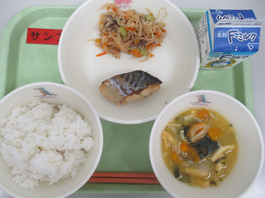 本日の献立は、ご飯、かぼちゃの味噌汁、鯖の塩麹焼き、千切大根の炒め煮。