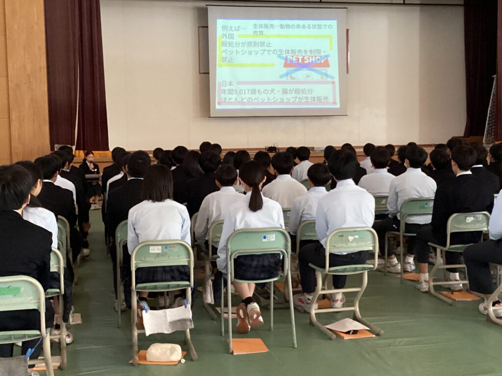 本校の2年生では、自分の将来について考え、志を作文にまとめ学級内で発表をし合う活動に取り組みました。志を交流する中で、互いの考えに触れ、自分自身の将来像を見つめる貴重な機会となりました。本日は、各学級の代表生徒による作文発表を「立志式」の中で実施しました。発表を通して、学年全体で将来の目標に向かって努力をしようとする意欲を高めあうことができました。発表者の 寺尾栄人さん、山根里奈さん、廣川羽美さん、真砂采芽さん ありがとうございました。 「立志式」の後半は、フリー・ザ・チルドレン・ジャパン 広瀬太智氏による講演が行われました。「目的のないまま大学に入るも、パラグアイ研究者の教授と出会い国際協力に興味をもったこと」「青年海外協力隊での活動内容」「帰国後、小学校教員を経て、フリー・ザ・チルドレンに入職したこと」など現在までの軌跡を語ってくださりました。「夢は変わってもいい、考え続けることが大切!」「自信を持って行動してみて!」「辛いことも、やりたいことにたどり着くためなら頑張ることができる!」という力強いメッセージをいただきました。
