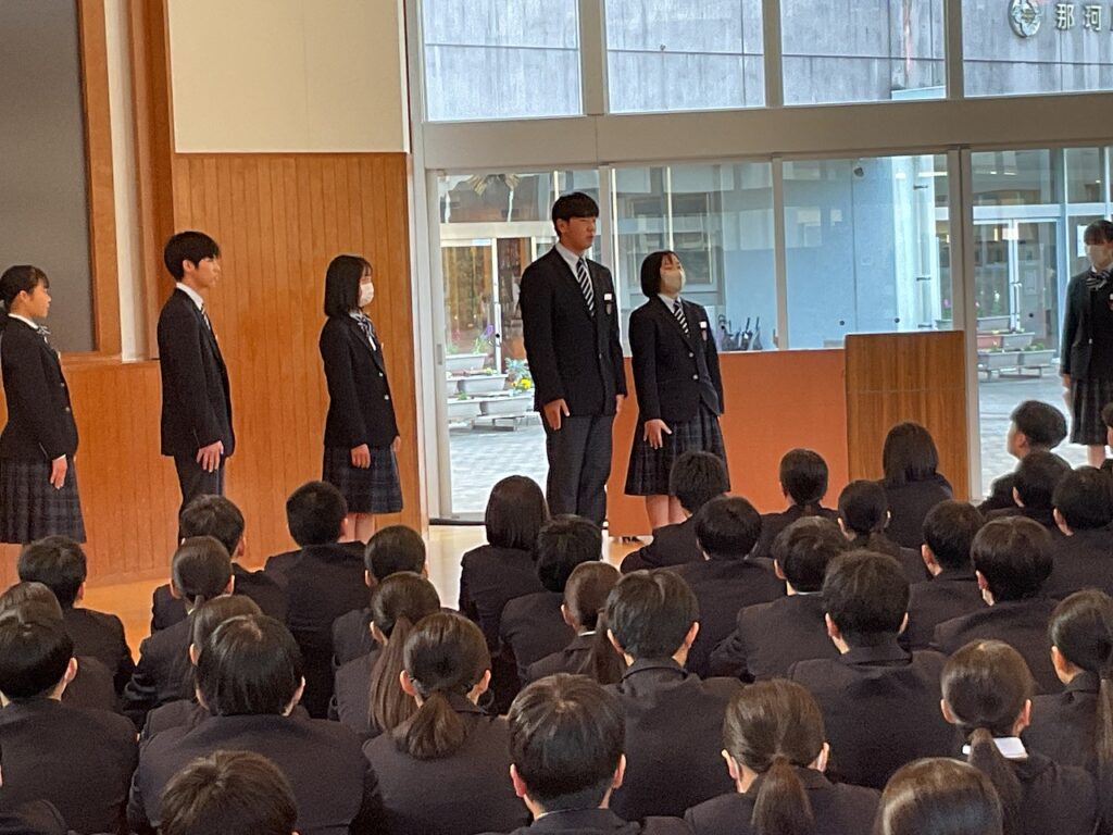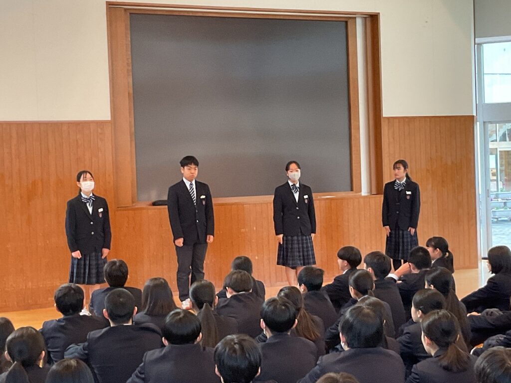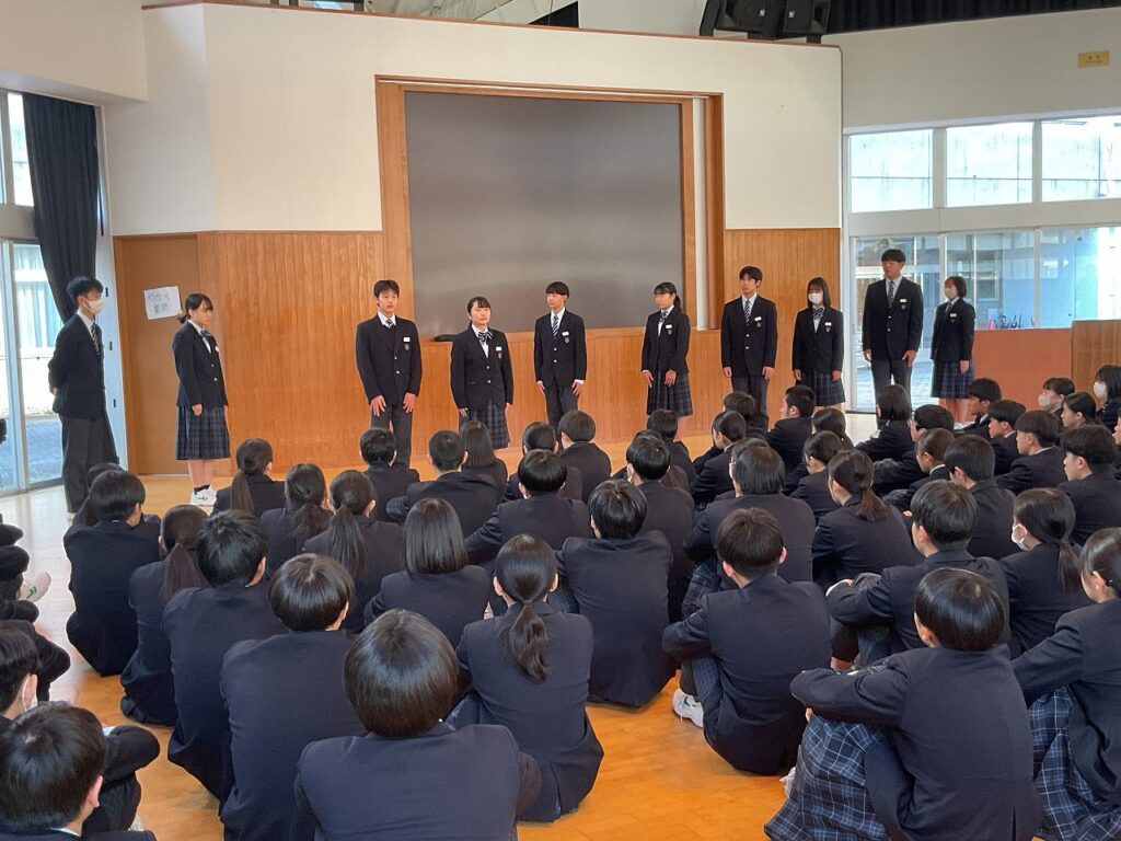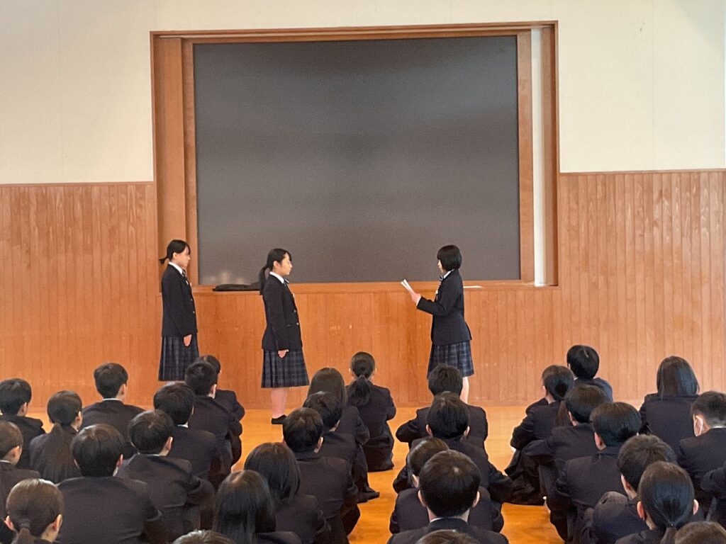 はじめに、各クラスの学級委員から、クラスの良いところや今後直していきたい点についての報告がありました。これまでの学級の歩みを振り返りながら、受験期を迎えるにあたっての課題を共有する機会となりました。続いて、旧生徒会執行部から後期の過ごし方についての話があり、学校全体を支えてきた立場から、3年生としての心構えが語られました