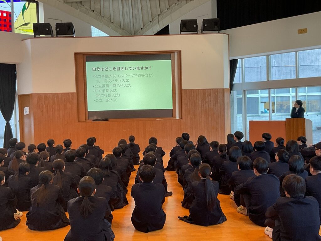 最後に、西原先生から受験に向けた日々の生活の在り方についてのお話がありました。生徒の進路決定の時期はそれぞれ異なり、受験が早く終わる生徒と、これから本番を迎える生徒とでは、気持ちに差が生まれやすい時期です。そのような中でも、互いに思いやりを持って接することで、学年全体が前向きに努力できる雰囲気をつくることができるというお話でした。面接練習に付き合ったり、受験が終わった後も一緒に学習したりする姿勢の大切さが伝えられました。