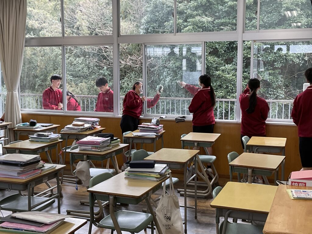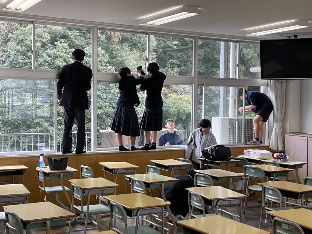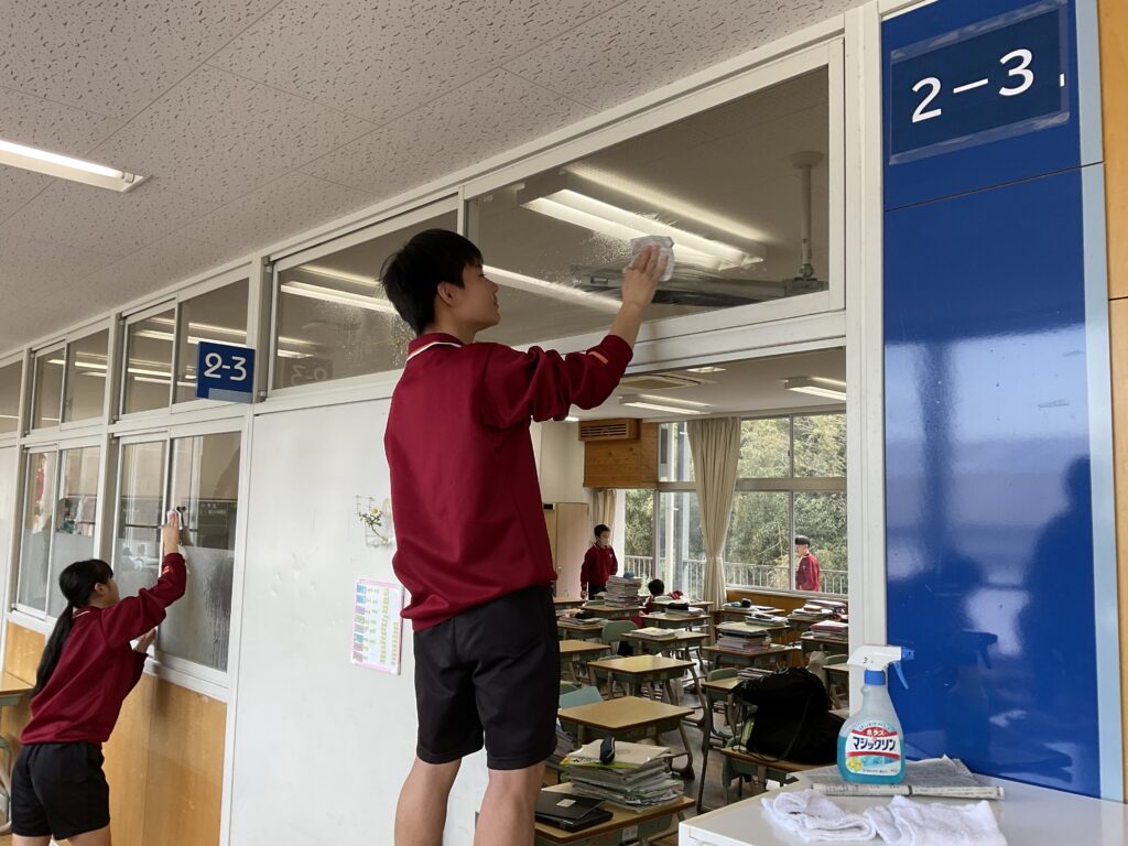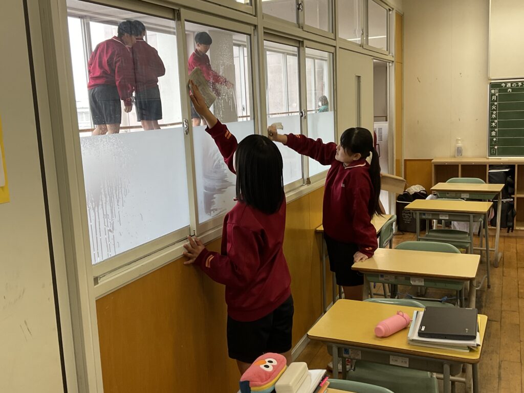 生徒たちはぞうきんやブラシを手に、教室の窓やベランダを丁寧に拭き上げていきました。普段の清掃時間ではなかなか手が届かない場所にも目を向け、協力し合いながら熱心に取り組む姿がとても印象的でした。活動後には、「クラスのために、清掃をすることができた」「感謝の気持ちを込めながら真剣に清掃をすることができた」「地域のボランティアは日程が合わず行けない時があるのでこういう機会があって良かった」「時間内を黙々とできて、隅々までできたのでとても掃除は大切だと気づけた」「今年最後のボランティアに参加でき、来年も参加できるように頑張りたい」といった達成感や主体的に行うことの大切さに迫る声が多く聞かれました。このようなボランティア活動を通して、身の回りの環境に気づき、自ら行動する力が育まれていることを実感します。今後も、生徒たちの思いやりと主体性を大切にしながら、今後も社会貢献力を高めていきたいと考えています。
