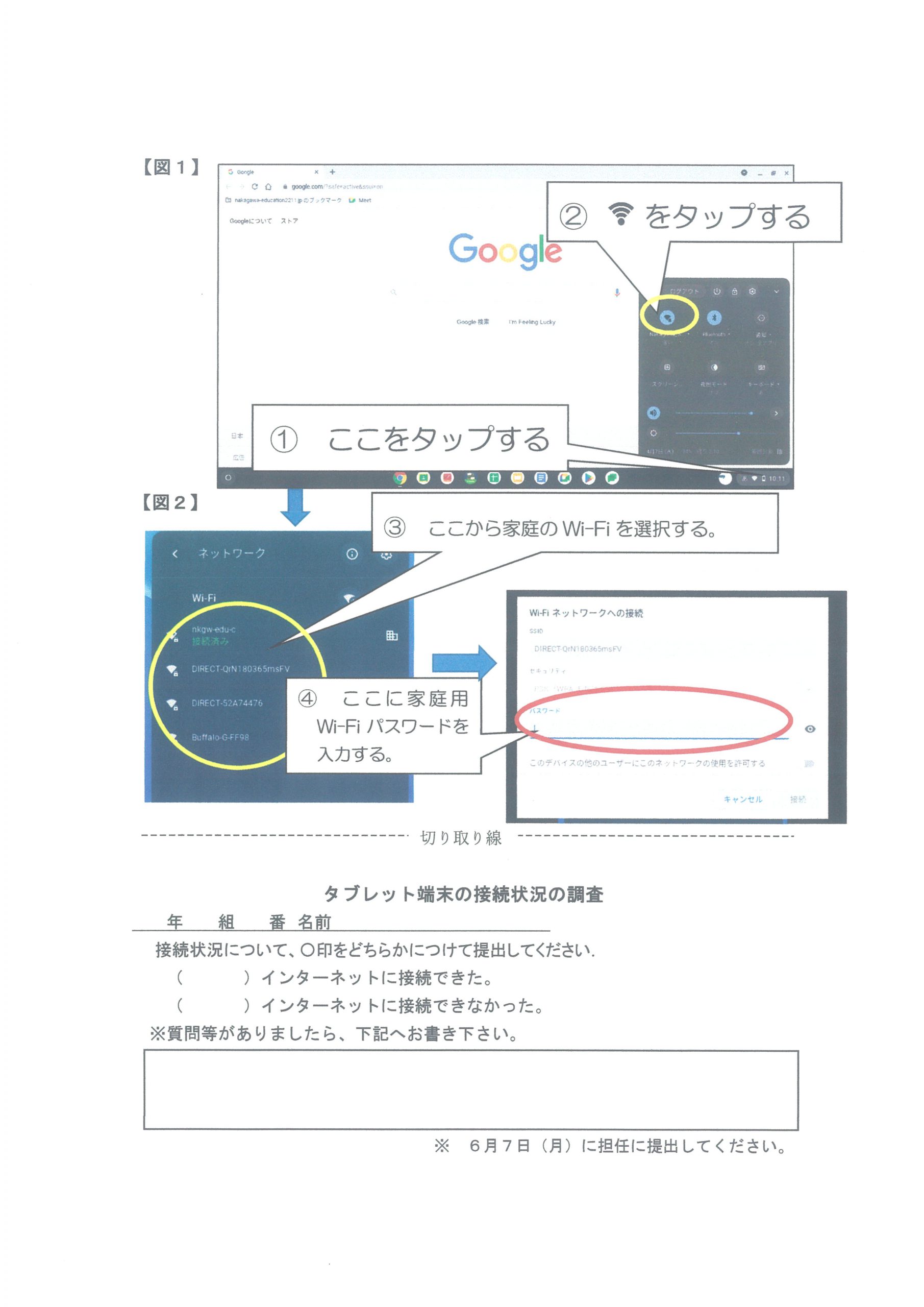 本日、今年度から全員に配布されるクロムブックを、ご家庭のWi-Fiへの接続確認のために生徒に持ち帰らせております。一応、帰りの会で校内放送を通して指示・説明しながら操作させ、全校生徒に家庭での操作手順を確認しています。Wi-Fi接続の方法を説明した文書も持ち帰らせておりますので、操作するお子さんをサポートしていただきながらご家庭でご確認をお願いいたします。