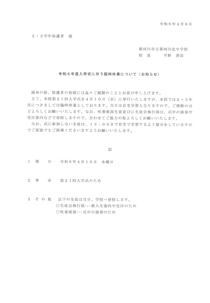 令和6年度入学式に伴う臨時休業について(お知らせ)