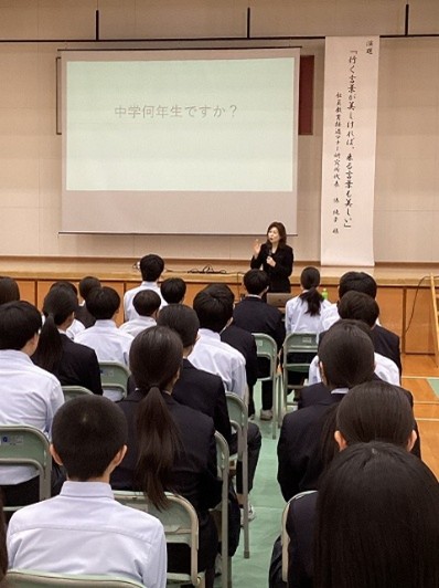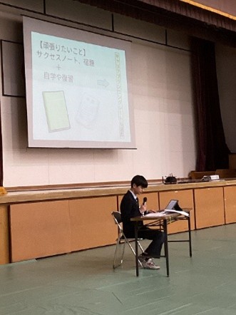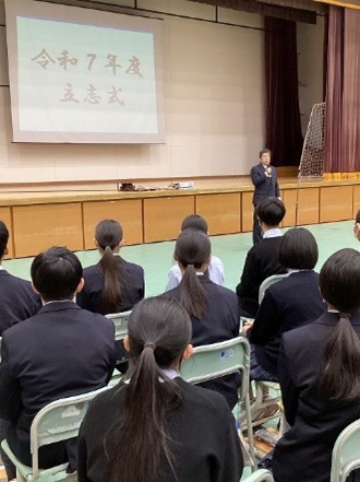 立志式では、各学級の代表生徒4名が、それぞれ「将来の夢や目標」などについて分かりやすくスライドにまとめるとともに、これを提示しながら「夢や目標をもったきっかけ」や「その実現に向けて自分自身が克服すべき現在の課題」「克服への決意」などについてまとめた作文を力強く読み上げました(右上)。また、作文発表後には来賓代表として本校CS協議会・明星孝一様より、ご自身の職業選択にまつわる体験を交えながら激励の言葉をいただきました(右中)。