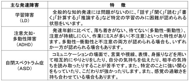 さて、2022年度に、文科省は、通常学級に在籍する小中学生のうち、8.8%が発達障害の可能性があるという調査結果を発表しています(2002年度調査では6.3%)。1クラス35人の通常学級の場合では、3人が発達障害ということになります。主な発達障害は、学習障害(LD)や注意欠陥・多動性障害(ADHD)、自閉スペクトラム症(ASD)が挙げられます。その特徴は以下のとおりです。