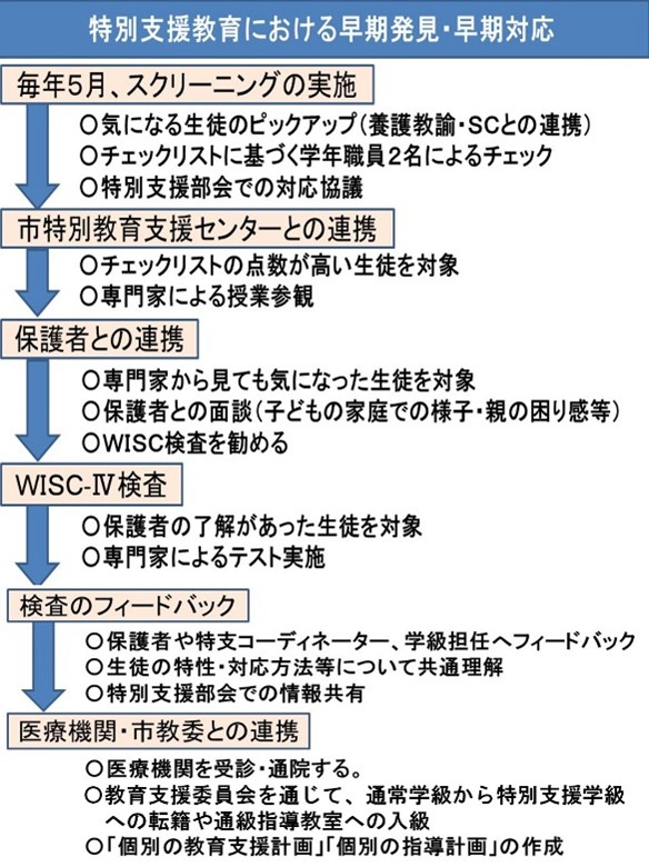 通常学級における発達障害の生徒については、早期発見・早期対応することが大切です。放っておくと学習や学級集団にうまく適応できず、自尊感情が低下したり問題行動を起こしたりする二次障害が起こるケースもあります。そのため、3歳児検診や就学時健診、小学校段階で発見・対応に努める必要があるといわれています。しかし、実際には中学校まで見過ごされるケースも少なくありません。そこで、本校では毎年以下のような取組を通じて早期発見・早期対応に努めています。