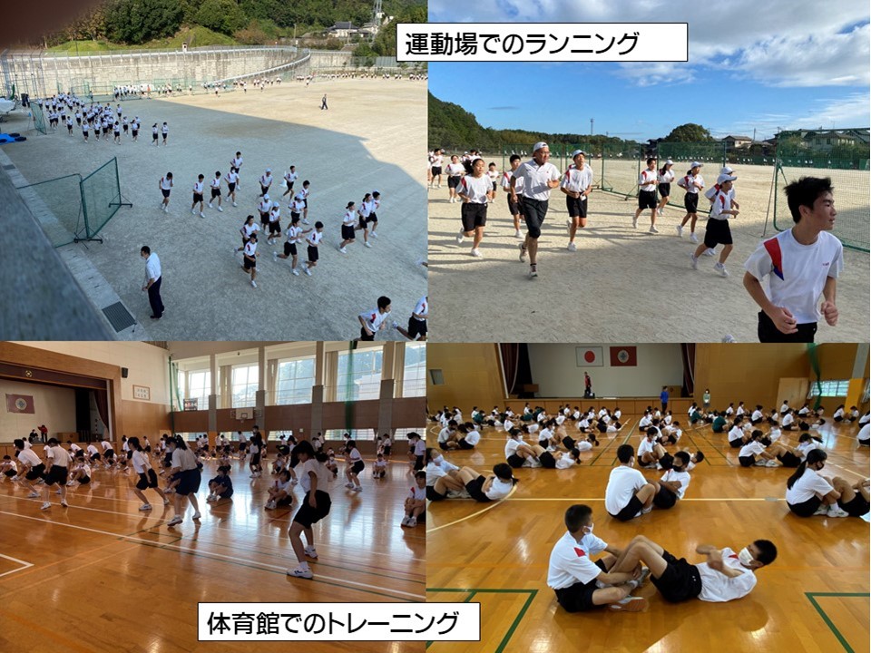 10月8日(木)から晴動雨読がスタートしました。朝自習の時間帯を使って、晴天時は運動(10分間のランニングや補強運動)、雨天時は読書を行う取組です(3年生は12月で終了)。朝、適度な運動を行うことは、体力向上だけではなく、脳の活性化による学力向上や精神の安定等に効果があります。3年生は部活動を引退してしばらく経っているので体力が落ちていないか心配でしたが、朝のランニングでは、受験勉強のストレスをぶつけるように一生懸命走っています。体育館では上体起こし、反復横跳び、握力強化、立ち幅跳びを行っています。