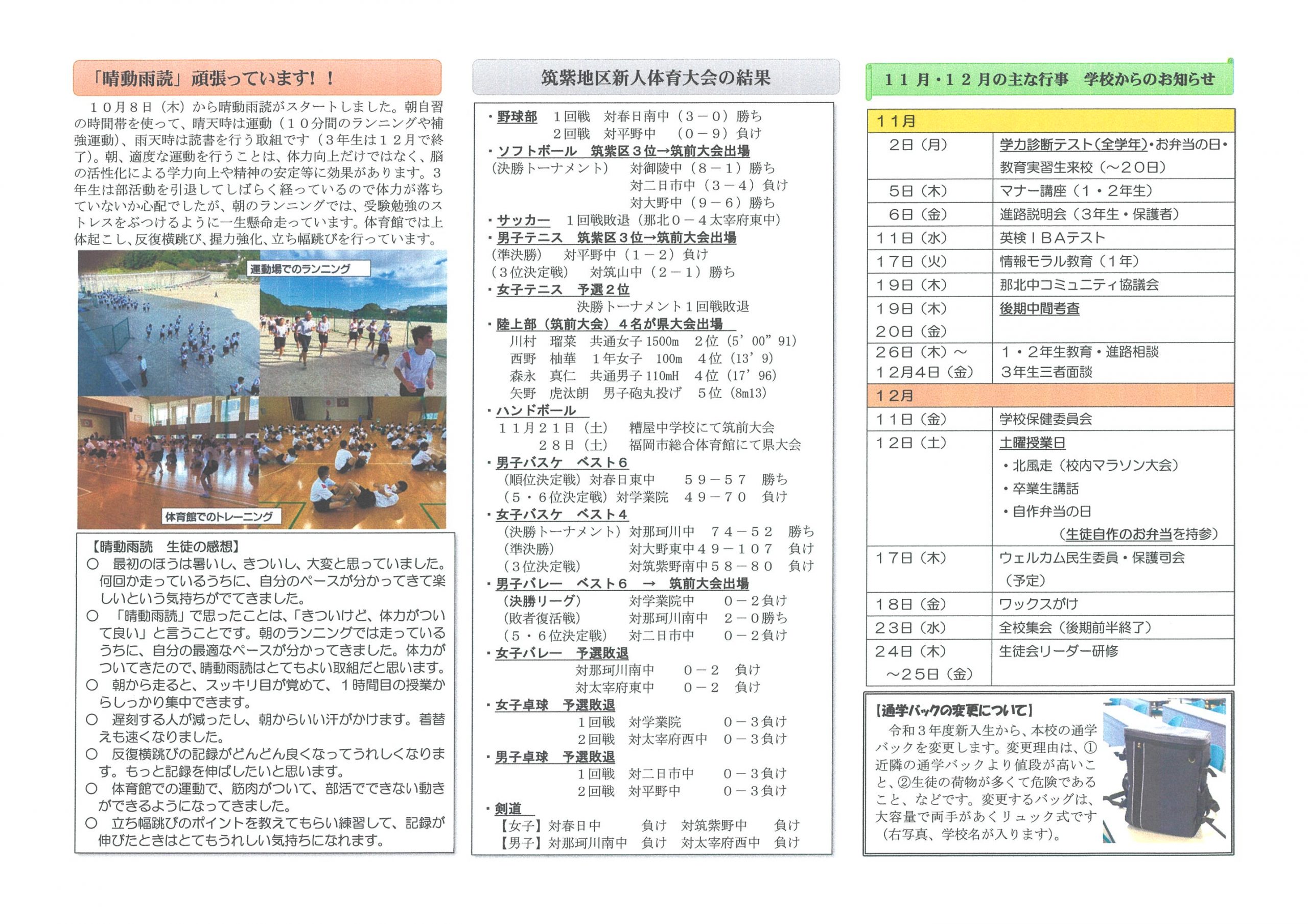 - 女子バスケ ベスト4 (決勝トーナメント)対那珂川中74-52勝ち、(準決勝)対大野東中49-107負け、(3位決定戦)対筑紫野南中58-80 負け