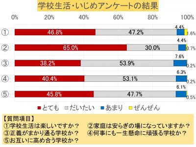 そのため、毎月行う「学校生活・いじめアンケート」の中でも、「学校生活」「家庭生活」の質問項目とともに、上記の3項目については毎回データをとっています(下グラフは9月の結果)。グラフを見ると、どの項目も「とても」「だいたい」が90%以上という比較的よい結果ですが、課題がないわけではありません。新生徒会執行部がスタートし、「TEAM SPIRIT」のスローガンのもと、今後も生徒同士のよりよい人間関係の形成やそのための能力の育成に努めていきたいと思います。